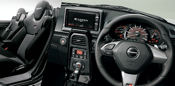 専用のレカロシート、MOMOのステアリング、足回りも強化してスポーツカーとしの剛性も確保しています。