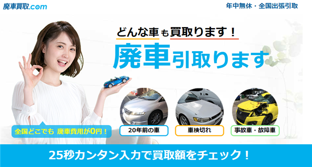 大手の車買取サイトを運営する廃車買取サービスで、どんな車でも0円引き取りをしています。