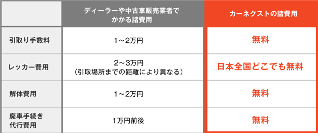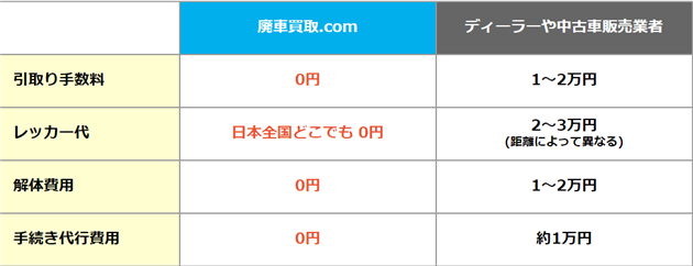 廃車買取.COMは、廃車したい車を簡単に廃車手続きを代行してくれるサービスで、普通にディーラーなどで廃車を依頼すれば以下のような費用が掛かるのが普通ですので、廃車買取.COMで無料で引き取りしてもらえば、これだけの節約にもつながりますよ!
