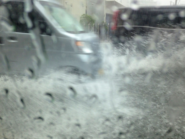 増水、冠水している道路は、車線も見えなくなり、車の走行も困難になります。無理に運転すると溝と道路の境目が分からず、側溝などにハマるリスクもあります。