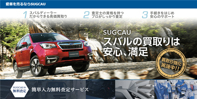 スバルの中古車サイトのSUGDAS(スグダス)は、中古車販売から中古車買取まで行うスバル運営で中古車査定はSUGCAU()スグカウという名称で運営されています。